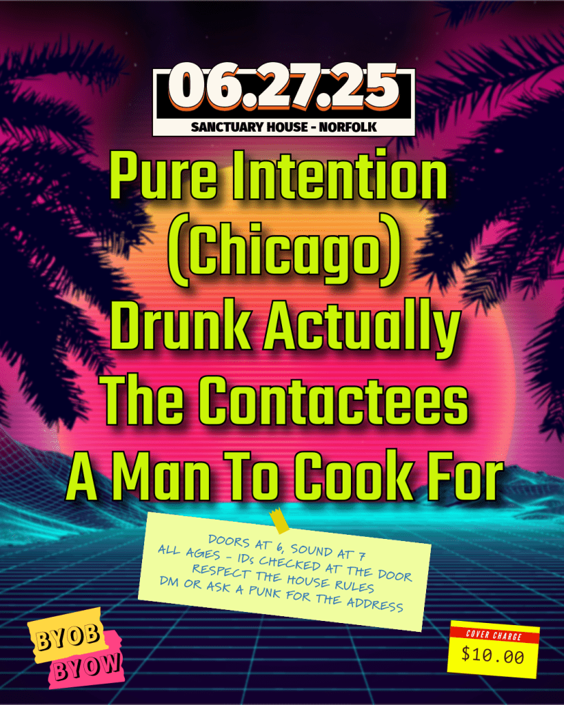 On Friday, June 27th, we’ll be at Sanctuary House with the homies from The Contactees, plus A Man To Cook For and Pure Intention (Chicago). Sanctuary House is a house venue owned and operated by our bassist, Ray. Send us a message or ask a punk for the address.